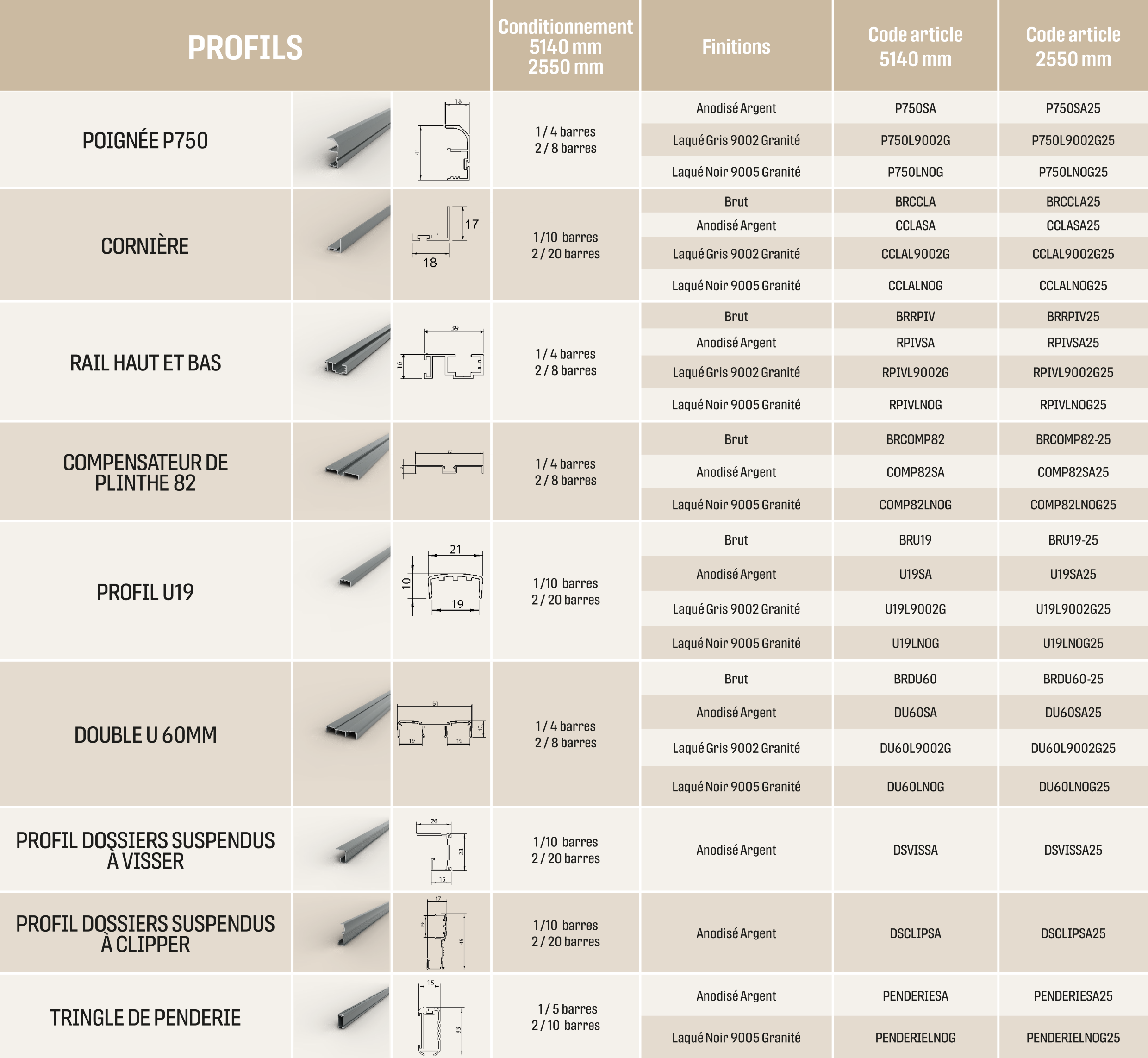 - P750 : profil poignée réversible pour remplissage 19mm.