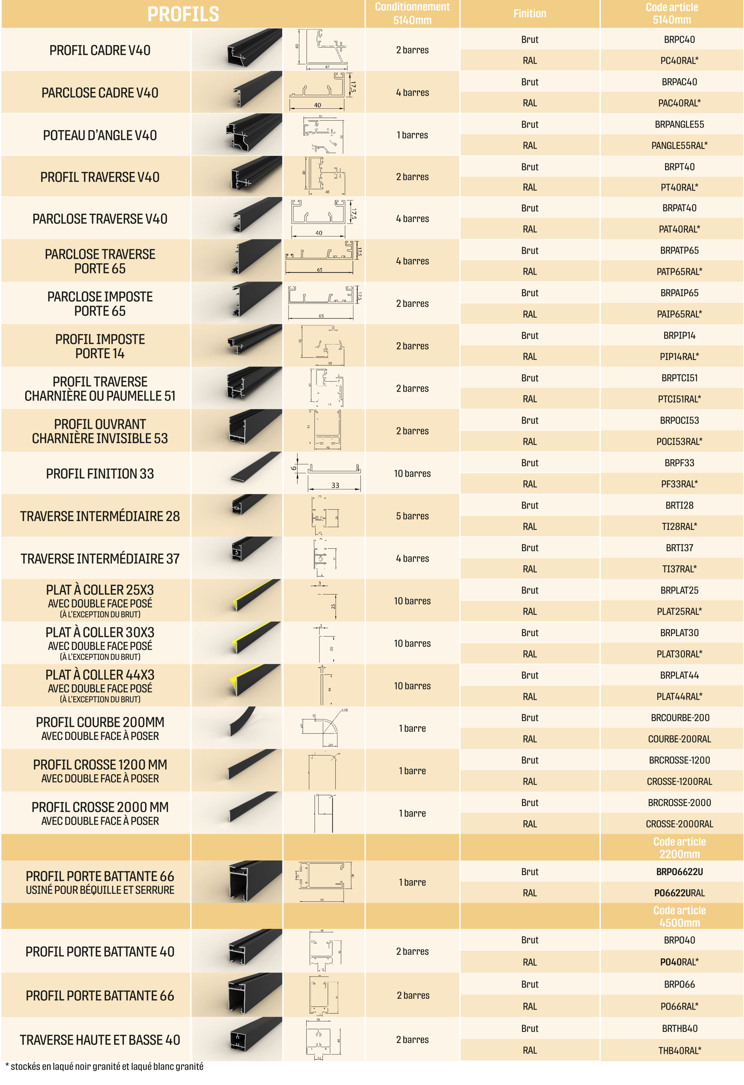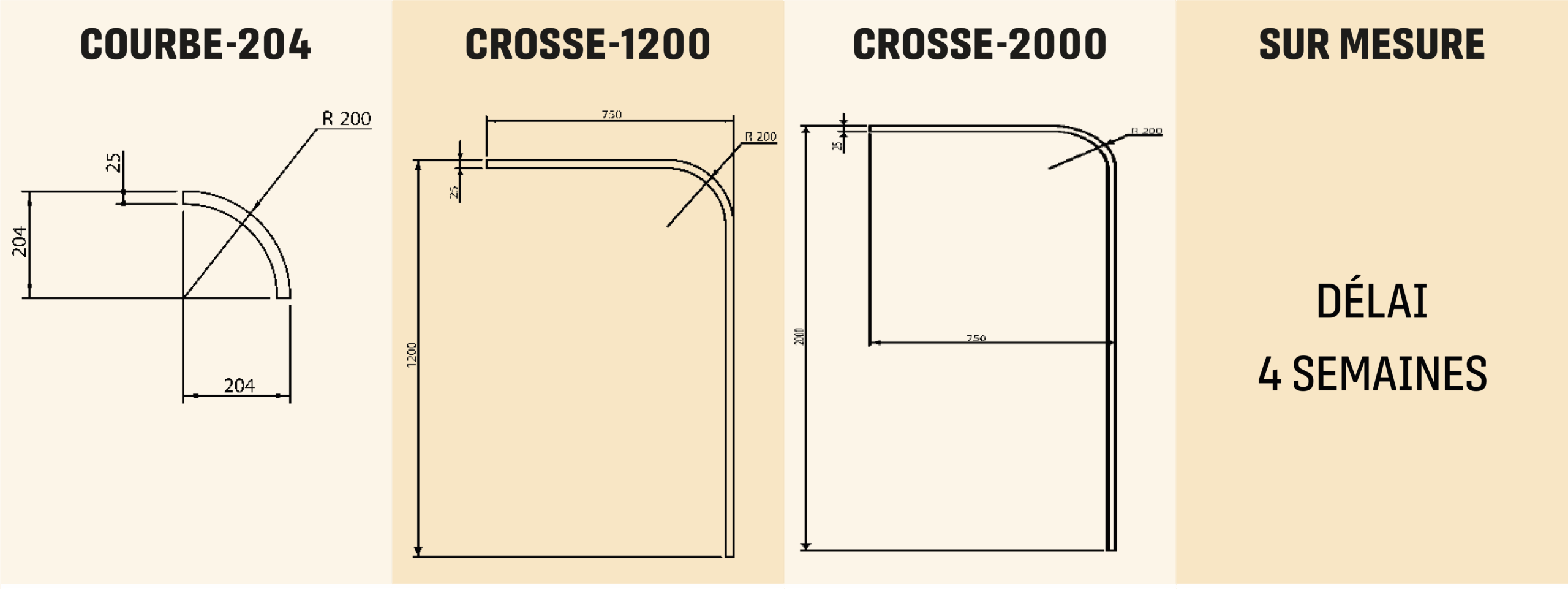 - Composition modulaire : traverses, plats à coller, plats cintrés.